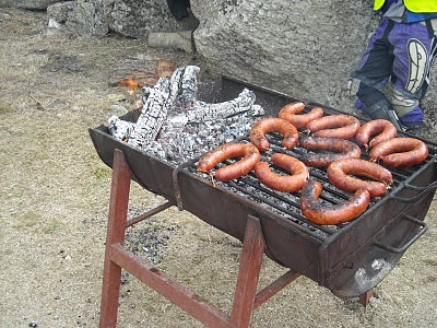 Depois veio o almoço. Chouriço e alheiras assados, porco no espeto, salada, pão. Tudo muito bom, foi difícil parar de comer. Também foi complicado comer, o vento era tanto que quando o copo e o prato estavam vazios voavam da mesa. A solução era ir mantendo tudo cheio!