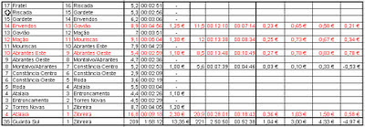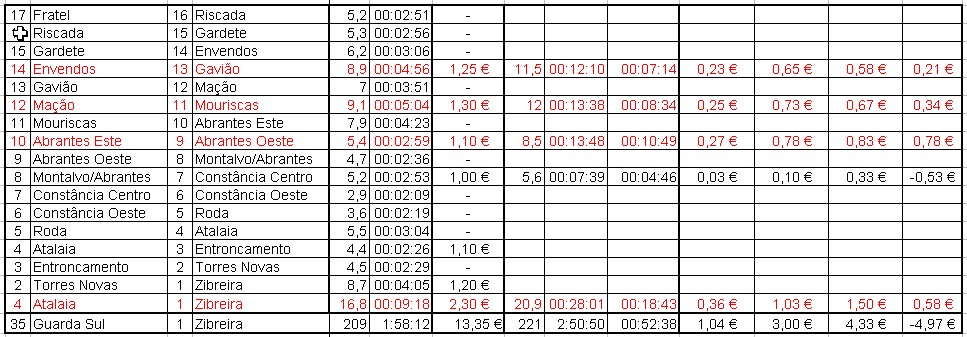 Em seguida deixo o quadro comparativo, onde são analisadas as várias opções desde o nó com a A1 até Espanha. Por vezes há zonas que se repetem, pois saindo da A25 só compensa entrar alguns nós mais à frente. O quadro tem o nó de inico e fim, os quilómetros e o tempo na A25, o preço da portagem onde existem pórticos, a distância, o tempo e a diferença de tempo em relação à A25 da alternativa. Do lado direito está a comparação entre a A25 e a alternativa em relação ao consumo de combustivel, ao desgaste da viatura por a distancia ser diferente e o custo do tempo.